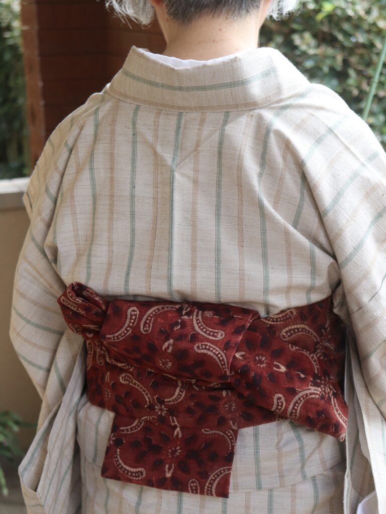 古い更紗をカーテンにしていたのですが、ある日半巾帯が必要になり、急遽仕立てたものです。